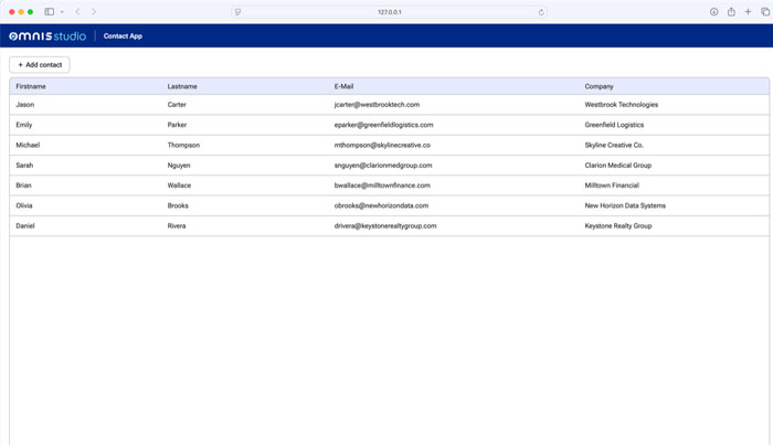 The Omnis Contacts app shows how to build a complete data-driven application using Omnis Studio together with a database. This demo lets you create, edit, and store contact records including names, company details, addresses, phone numbers, profile images and more. You can browse all contacts and learn how the forms and data structures behind the scenes are implemented. The example provides a solid introduction to creating business apps that interact with relational databases in Omnis Studio.